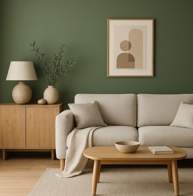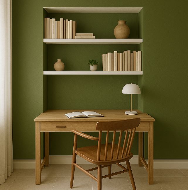 橄欖綠牆特別適合用於客廳、臥室或書房等需要營造放鬆氣氛的空間。其自然柔和的色調,有助於降低視覺壓力,打造居家環境中寧靜舒適的生活角落。