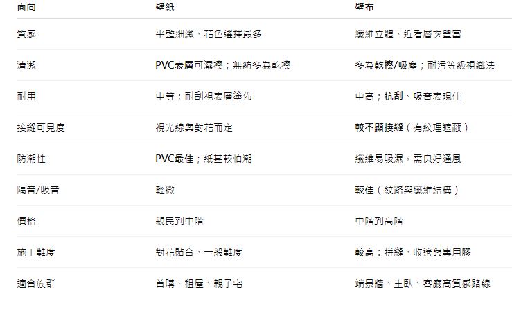 先釐清你的重點是預算、好清潔、隔音、或高級觸感,再選「壁紙或壁布」。