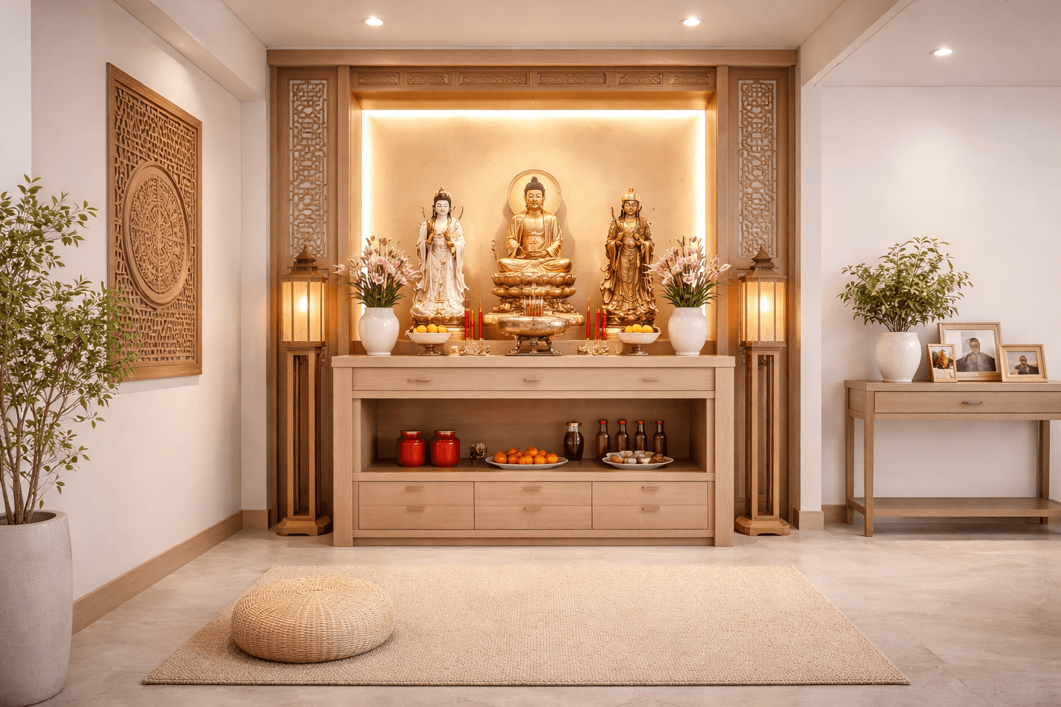 只要在材質、比例、燈光與收納上做好規劃,神明廳一樣可以既保有文化敬意,也自然融入現代居家生活。