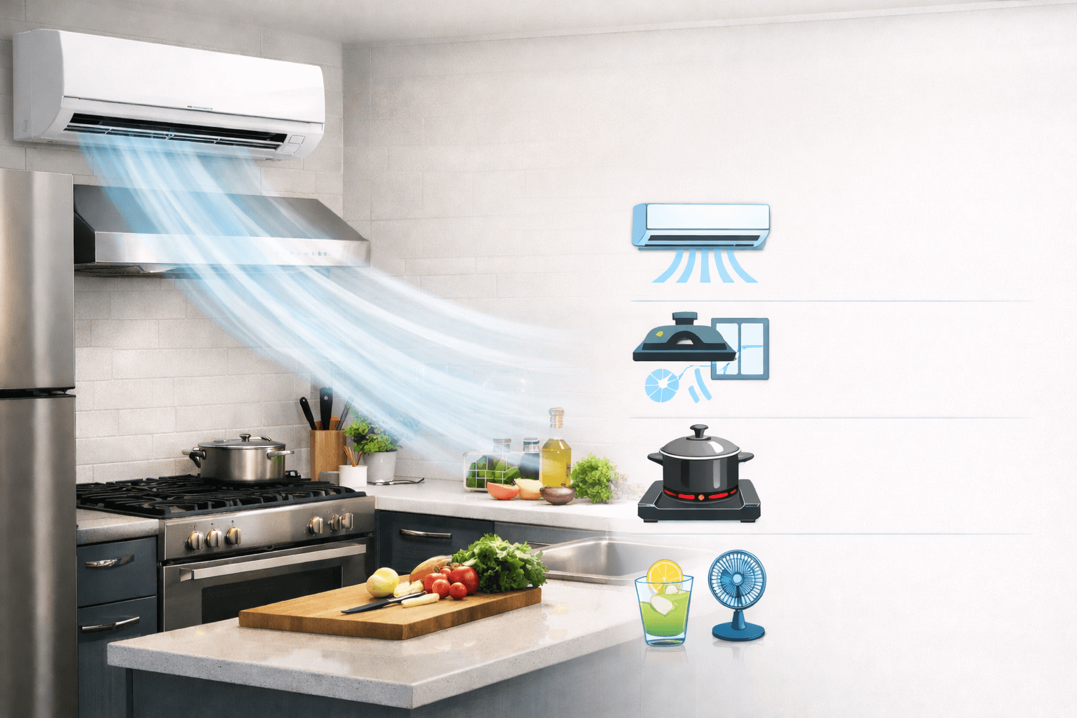 瓦斯火、烤箱、洗碗機、熱水、油煙與高濕,都會把廚房變成小型烤箱。