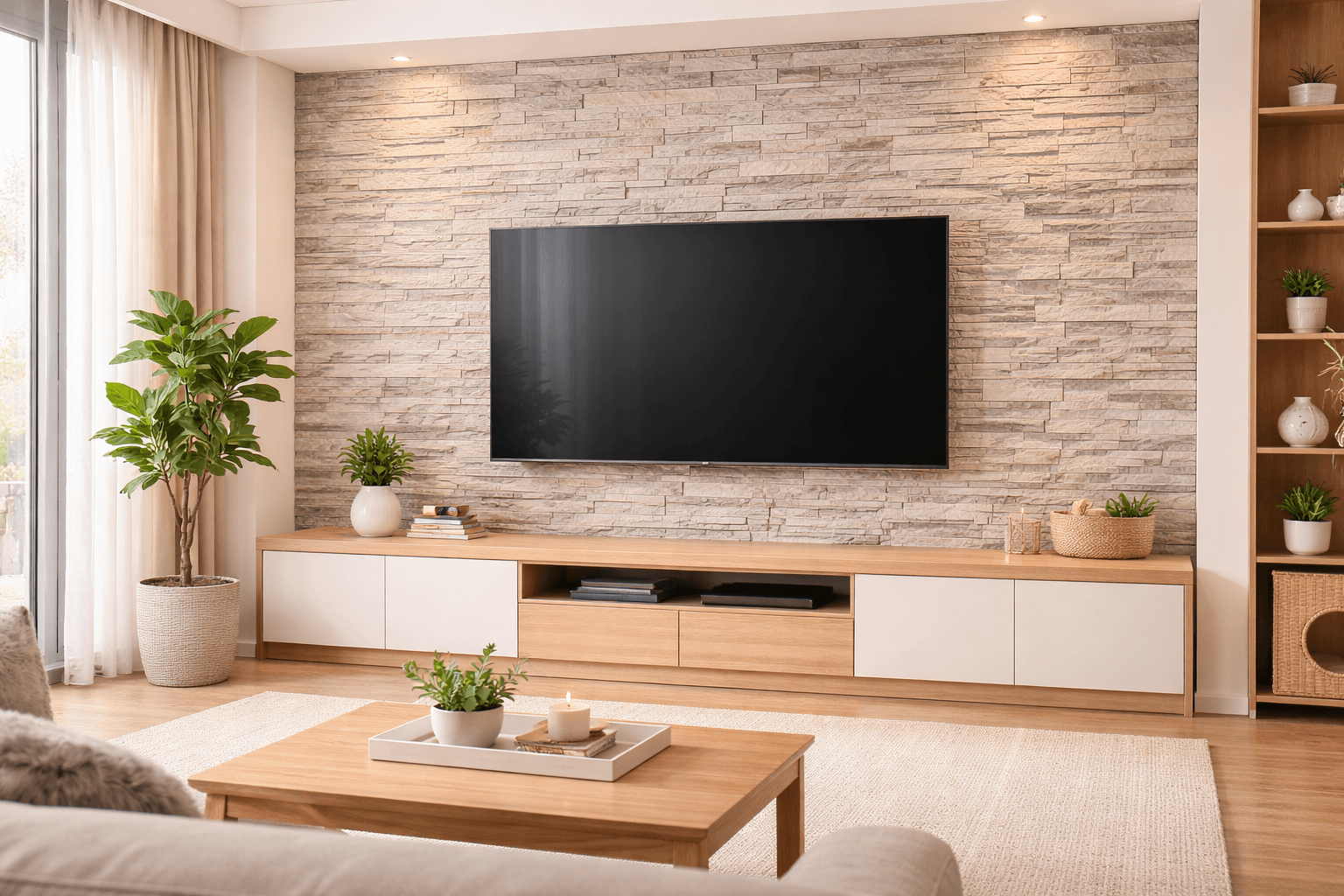 電視牆通常會涉及插座、線材、壁掛電視與設備配置,因此文化石施工前要先規劃好收邊與孔位,避免完工後影響整體美感。