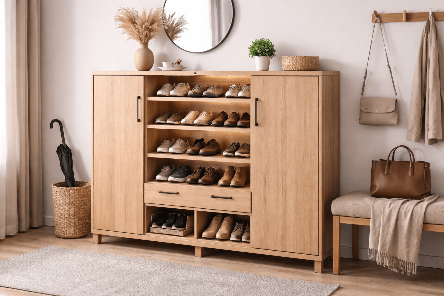 梅雨季、潮濕天氣或冬季濕氣較重時,可特別加強吸濕與通風,避免鞋櫃內部長時間潮潮的。